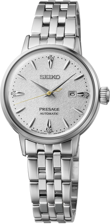 Seiko Presage Cocktail Time. Offering the finest in Japanese mechanical watchmaking, the Presage Collection blends precision technology with superior craftsmanship and design. Inspired by hot cocktails under the softer sunlight of autumn and winter, this Cocktail Time series expresses the tones and hues of the cooler seasons. Atop a stunning white pressed pattern dial evoking the Hot Buttered Rum cocktail, four diamonds, artfully incorporated into the signature markers, add a luxurious sparkle to the extraordinary design. The gracefully slender case houses a slim, 21-jewel automatic movement, which beats at a frequency of 21,600 vibrations per hour, with a power reserve of approximately 41 hours and manual winding capability. Crafted of stainless steel, this sleek timepiece includes an elegantly tapered five-row bracelet, with mirror finish for added brilliance, as well as a date calendar, box shaped crystal, and deployment clasp with push button release. 5 bar, 50M Water Resistant