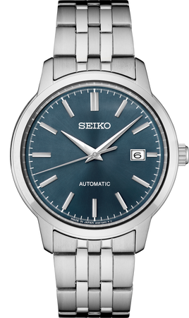 From the Essentials Collection. Adding classic automatic timekeeping to the Essentials Collection, this versatile timepiece winds with the movement of the wearerβs wrist, and never needs a battery. Visible through the screwdown see-through caseback, the 23-jewel movement beats at a frequency of 21,600 vibrations per hour, with a power reserve of approximately 41 hours and manual winding capability. With a sophisticated sunray finish, the blue dial includes a calendar and crisply defined hands and markers. Crafted of stainless steel, with tri-fold push button release clasp. 10 bar, 100M Water Resistant