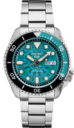 Seiko 5 Sports Collection. A tribute to Seikoβs iconic βTime Sonarβ of the 1970s, this exceptional watch features a distinctive translucent turquoise dial offering a view of the day-date disk. Framed by a bi-color uni-directional rotating bezel, the dial also features bold luminous hands and markers, and a contrasting seconds hand accent. Providing automatic technology that you control with every movement, this dynamic timepiece is powered by a 24-jewel movement that beats at a frequency of 21,600 vibrations per hour, with a power reserve of approximately 41 hours and manual winding capability, visible through the screwdown see-through caseback. Crafted of stainless steel with a locking tri-fold push button release clasp. 10 bar, 100M Water Resistant