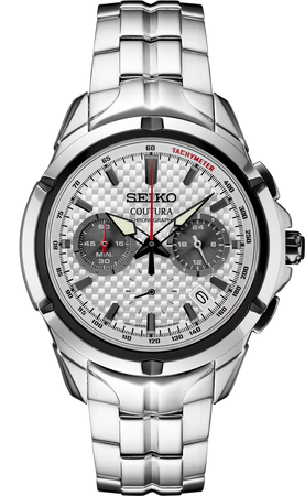 From the Coutura Collection. Delivering the perfect blend of technology and design for those on the move, the Coutura Collection combines bold angularity and shading with superior timekeeping for effortless sport/dress style. Inspired by motor sports, with a new case and bracelet design incorporating the angles and edges of racecar architecture, this dashingly sculpted chronograph features a multi-layer carbon-fiber patterned silver dial styled to suggest a dashboard, with prominent 24-hour and chronograph minute subdials at 3 and 9 oβclock, tachymeter outer ring, date calendar, red chronograph hand, and LumiBrite hands and markers. Applied markers and subdial rings add a rich dimensionality, while the black accents punctuating the bezel provide a sense of propulsive action. Crafted of stainless steel, this dynamic watch includes a sapphire crystal, screwdown caseback, tri-fold push button release clasp and classic cabochon crown. The chronograph function offers timing to 60 minutes in 1/5-second increments with split time measurement. 10 bar, 100M Water Resistant