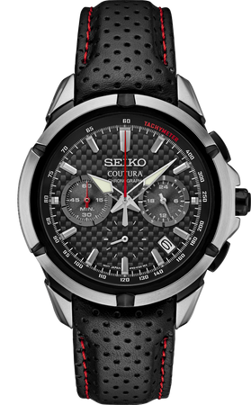 From the Coutura Collection. Delivering the perfect blend of technology and design for those on the move, the Coutura Collection combines bold angularity and shading with superior timekeeping for effortless sport/dress style. Inspired by motor sports, with a new case design incorporating the angles and edges of racecar architecture, this dashingly sculpted chronograph features a multi-layer carbon-fiber patterned black dial styled to suggest a dashboard, with prominent 24-hour and chronograph minute subdials at 3 and 9 oβclock, tachymeter outer ring, date calendar, and LumiBrite hands and markers. Applied markers and subdial rings add a rich dimensionality, while the black accents punctuating the bezel provide a sense of propulsive action. Designed to echo driving gloves, the black perforated leather strap includes red contrast stitching and a tri-fold push button release clasp. With a stainless steel case, this dynamic watch includes a sapphire crystal, screwdown caseback, and classic cabochon crown. The chronograph function offers timing to 60 minutes in 1/5-second increments with split time measurement. 10 bar, 100M Water Resistant