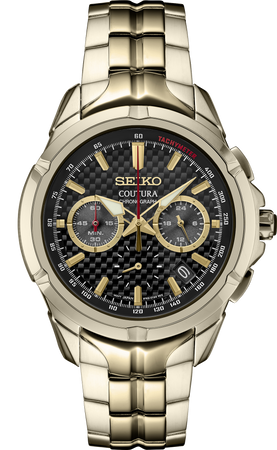 From the Coutura Collection. Delivering the perfect blend of technology and design for those on the move, the Coutura Collection combines bold angularity and shading with superior timekeeping for effortless sport/dress style. Inspired by motor sports, with a new case and bracelet design incorporating the angles and edges of racecar architecture, this dashingly sculpted chronograph features a multi-layer carbon-fiber patterned black dial with prominent 24-hour and chronograph minutes subdials at 3 and 9 oβclock styled to suggest a dashboard, tachymeter outer ring, date calendar, red chronograph hand, and LumiBrite hands and markers. Applied markers and subdial rings add a rich dimensionality, while the grooved bezel provides a sense of propulsive action. Crafted of stainless steel in a light gold finish, this dynamic watch includes a sapphire crystal, screwdown caseback, tri-fold push button release clasp and classic cabochon crown. The chronograph function offers timing to 60 minutes in 1/5-second increments with split time measurement. 10 bar, 100M Water Resistant