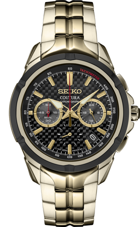 From the Coutura Collection. Delivering the perfect blend of technology and design for those on the move, the Coutura Collection combines bold angularity and shading with superior timekeeping for effortless sport/dress style. Inspired by motor sports, with a new case and bracelet design incorporating the angles and edges of racecar architecture, this dashingly sculpted chronograph features a multi-layer carbon-fiber patterned black dial with prominent 24-hour and chronograph minutes subdials at 3 and 9 oβclock styled to suggest a dashboard, tachymeter outer ring, date calendar, red chronograph hand, and LumiBrite hands and markers. Applied markers and subdial rings add a rich dimensionality, while the grooved black bezel provides a sense of propulsive action. Crafted of stainless steel in a light gold finish, this dynamic watch includes a sapphire crystal, screwdown caseback, tri-fold push button release clasp and classic cabochon crown. The chronograph function offers timing to 60 minutes in 1/5-second increments with split time measurement. 10 bar, 100M Water Resistant