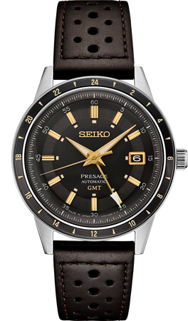 Presage Style60's GMT. Offering the finest in Japanese mechanical watchmaking, the Presage Collection blends precision technology with superior craftsmanship and design. Inspired by the steering wheel, levers, instruments and metallic colors of vintage 1960s touring cars, the Style60's GMT models create a distinctive retro feel with broad angular lines, box-shaped crystals, faceted indices and sharp hand design. Celebrating the spirit of the decade, the collection incorporates dial elements from Seiko’s 1964 “Crown Chronograph,” Japan’s first watch with a stopwatch function. Framed by a black and dark gray 24-hour GMT bezel, the dark brown-gray dial features gold accents, a date calendar, a GMT hand, and LumiBrite hands and markers. The screwdown see-through caseback provides a view of the 24-jewel movement with manual winding capability, a frequency of 21,600 vibrations per hour and a power reserve of approximately 41 hours. Crafted of stainless steel, in a new hairline finish suggesting the metallic, machine-like feel of ’60s cars, this memorable timepiece includes a brown perforated leather strap echoing classic interior elements. 10 bar, 100M Water Resistant