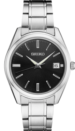 From the Essentials Collection. With classic dress/sport styling, this perfectly tailored design combines sophisticated minimalism with versatility. The rich black dial features a date calendar and LumiBrite hands. In stainless steel, with sapphire crystal for superior scratch resistance. 10 bar, 100M Water Resistant