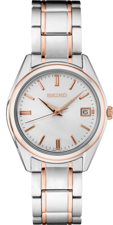 From the Essentials Collection. With classic dress/sport styling, this perfectly tailored design combines sophisticated minimalism with versatility. The sunray-finish silver dial features a date calendar and LumiBrite hands. In stainless steel, with rose-gold two-tone finish, and sapphire crystal for superior scratch resistance. 10 bar, 100M Water Resistant