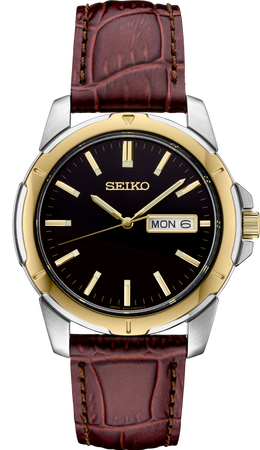 From the Essentials Collection. Offering classic dress/sport designs, the Essentials Collection provides the ideal solution for both everyday wear and dress occasions. Crafted with a two-tone brushed and polished stainless steel case and brown leather strap, this perfectly tailored design features a charcoal sunray dial with gold accents, day/date calendar, and LumiBrite hands and markers. 10 bar, 100M Water Resistant
