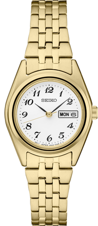 From the Essentials Collection. Offering classic dress/sport designs, the Essentials Collection provides the ideal solution for everyday wear. Crafted of stainless steel in gold-tone finish, this perfectly balanced watch features a white dial with Arabic numerals and day/date calendar for a superb blend of clarity and style. 10 bar, 100M Water Resistant