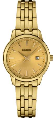 From the Essentials Collection. Offering classic designs, the Essentials Collection provides the ideal solution for all-day wear. Crafted of stainless steel in gold-tone finish, this perfectly tailored watch features a contemporary minimalist champagne dial with gold hands and markers, as well as a date calendar, for a superb blend of clarity and style. 5 bar, 50M Water Resistant