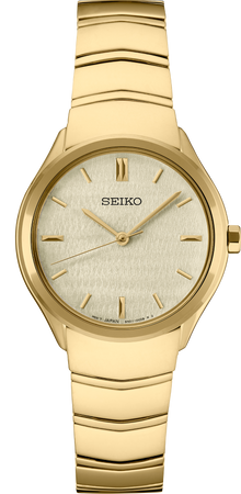 From the Essentials Collection. With sleek sophistication, this distinctively modern watch makes an immediate style statement. The clean, minimalist dial, in light champagne with simple stick markers, features a subtly varying metallic texture for added visual interest, while the soft curves of the bracelet are highlighted by a mirror and hairline finish. In stainless steel with rich gold finish, this memorable timepiece includes a tri-fold push button release clasp. 5 bar, 50M Water Resistant