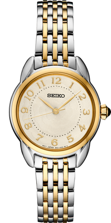 From the Essentials Collection. With elegant, jewelry-inspired styling, this gracefully updated watch features a sophisticated ivory dial with a subtle center radial pattern, gold hands, and gold-tone Arabic numerals for easy reading of the time at a glance. Including a classic cabochon crown, this beautifully balanced design is crafted of stainless steel with a two-tone finish and offers a tri-fold push button release clasp. 5 bar, 50M Water Resistant