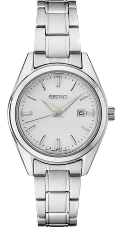 From the Essentials Collection. With classic dress/sport styling, this perfectly tailored design combines sophisticated minimalism with versatility. The silver sunray-finish dial features a date calendar and LumiBrite hands. In stainless steel, with sapphire crystal for superior scratch resistance. 10 bar, 100M Water Resistant
