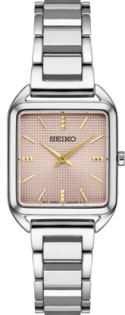 From the Essentials Collection. With a fresh square case design, this light and slim watch is proportioned for a perfect fit. The contemporary muted mauve pink die-stamped grid pattern dial and subtly textured markers add a hint of sophisticated luxury. Crafted of stainless steel with tri-fold push button release clasp. 5 bar, 50M Water Resistant