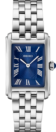 From the Essentials Collection. A sophisticated classic, perfectly proportioned for a jewelry-like feel, this elegant rectangular case watch offers a patterned blue Roman numeral dial, silver hands and markers, and a blue cabochon crown. Crafted of stainless steel, this graceful design includes a five-row stainless steel bracelet for sleek wearing comfort, and a tri-fold push button release clasp. 5 bar, 50m Water Resistant