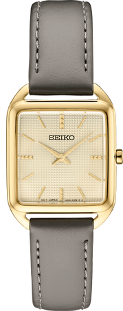 From the Essentials Collection. With a fresh square case design, this light and slim watch is proportioned for a seamless fit. The contemporary light champagne die-stamped grid pattern dial and subtly textured gold markers add a hint of sophisticated luxury. This design is crafted of stainless steel with gold finish and is paired with a gray leather strap. 5 bar, 50M Water Resistant