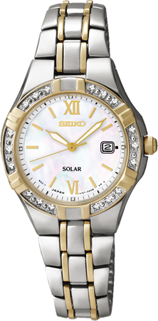 Seiko Solar with diamonds. No battery change required and powered by all types of light. Solar cell with high performance electricity generation. Energy-efficient movement with long power reserve. This dress watch has a two-tone stainless steel case and bracelet with mother-of-pearl dial which creates an elegant finish. The timepiece is finished with 18 diamonds around the bezel. Date calendar. 100 meters water resistant.