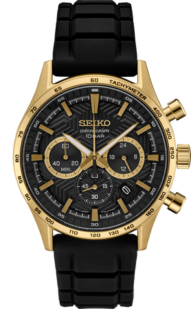 From the Essentials Collection. Designed to evoke the cool thrill of driving by night, this smooth chronograph offers a slim profile for sleek sport or everyday wear. Framed by a gold tachymeter bezel, the rich black dial with gold accents adds a streetwear edge with its y-shaped shoe-sole inspired pressed pattern. With three subdials, including a 24-hour indicator and a date calendar, the dial also features LumiBrite hands and markers. Chronograph timing provides measurement of up to 60 minutes of elapsed time in 1/5-second increments. Crafted of stainless steel, the case features a gold finish and a scratch resistant sapphire crystal, and is paired with a black silicone strap. 10 bar, 100M Water Resistant