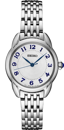 From the Essentials Collection. With elegant, jewelry-inspired styling, this gracefully updated watch features a sophisticated white dial with subtle center radial pattern, blue hands, and blue Arabic numerals for easy reading of the time at a glance. Including a classic cabochon crown, this beautifully balanced design is crafted of stainless steel and offers a tri-fold push button release clasp. 5 bar, 50M Water Resistant