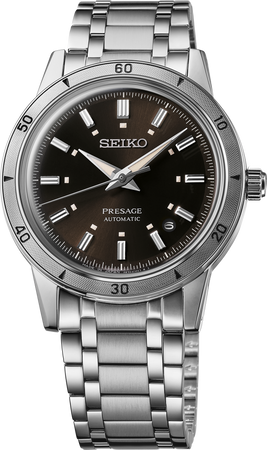 Presage Style60's Collection. Celebrating the fresh spirit of the 1960s, this design is an homage to Seiko’s 1964 “Crown Chronograph,” combining a bold ruggedness with a refined and tailored style. Framed by a metallic bezel with laser engraved details, the sunray finish dial inherits the layout of the original model with a dark brown color inspired by vintage work jackets. The faceted indices are polished for an elegant shine, enhanced by the stainless steel case and box shaped crystal, providing beautiful dimensionality. Visible underneath the screwdown see-through caseback, the 23-jewel automatic movement beats at a frequency of 21,600 vibrations per hour and offers manual winding capability with a power reserve of approximately 41 hours. Crafted of stainless steel, this versatile timepiece features a sophisticated multi-row bracelet, tri-fold push button release clasp, a date calendar and LumiBrite hands and markers for superior visibility. 5 bar, 50M Water Resistant