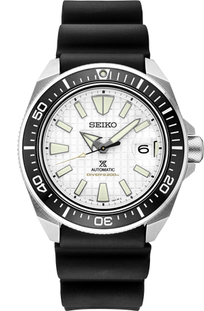 Prospex Automatic Diver. Designed for those who treat life as the ultimate adventure, the Seiko Prospex line meets every challenge with technological excellence and winning design. Inspired by Seikoβs most iconic diving styles, this distinctive watch includes such upgrades as a black ceramic one-way rotating elapsed timing bezel, magnified date window and sapphire crystal with anti-reflective coating on the inner surface. The white dial, with LumiBrite hands and markers, has a 3-D pattern reflecting the shape of the black and gray bezel edge. For reliable underwater timekeeping, the 23-jewel automatic movement beats at a frequency of 21,600 vibrations per hour, with a power reserve of approximately 41 hours, and can be wound manually or automatically. Crafted of stainless steel, with black silicone strap and secure screwdown crown and caseback, this high-intensity timepiece follows ISO standards for scuba diving. 200m Water Resistant