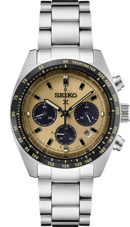 Seiko Speedtimer Solar Chronograph. Designed for those who treat life as the ultimate adventure, Seiko Prospex keeps moving forward, meeting every challenge with technological excellence and winning design. Combining precision timing with wearability and the energy efficiency of solar power, this exceptional watch, inspired by Seikoβs first precision chronographs, developed for international sporting competitions in 1964, provides chronograph measurement of up to 60 minutes of elapsed time in 1/5-second increments and includes a split time function. The solar cell, powered by any light source, with no battery change required, offers a 6-month power reserve when fully charged. Framed by a black tachymeter bezel, the yellow dial, with distinctive sand-blasted texture, features three black subdials, including a 24-hour indicator, as well as a date calendar and beige LumiBrite hands and markers. In stainless steel, with curved anti-reflective sapphire crystal, this rugged timepiece also offers the security of a screwdown caseback and tri-fold push button release clasp. 10 bar, 100M Water Resistant