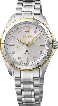 Prospex Sea Series. Designed for those who treat life as the ultimate adventure, the Seiko Prospex line meets every challenge with technological excellence and style. Taking on a sporty, yet refined impression, this beautiful series, created with a sleek profile and proportions specially tailored for a sophisticated look, features both enhanced water-resistance for marine adventures and an elegance suited for finer occasions. An extraordinary blend of form and function, the impressive timepiece displays a silver sunray finish dial with gold accents, 8 sparkling diamonds for a touch of luxury, and LumiBrite hands for superior visibility in low-light conditions, topped with a scratch-resistant sapphire crystal with anti-reflective coating on the inner surface. Crafted of stainless steel with a high polish multi-faceted bezel catching the light from multiple directions, the versatile watch is designed with a built-in crown protector, a secure tri-fold push button release clasp, and a screwdown caseback. 20 bar, 200M Water Resistant