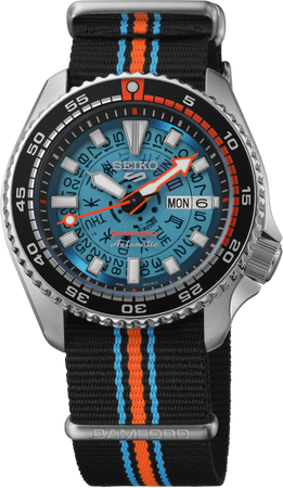 Seiko 5 Sports BAMFORD Limited Edition. In collaboration with BAMFORD, a high-end custom watch brand from London, and paying tribute to Seiko’s iconic SKX series of the 1980s, this exceptional Limited Edition is only available in a controlled production run of 2,025 pieces. Featuring a distinctive translucent turquoise dial, with red-orange and white accents, allowing a unique view of the full English/ Kanji day and date wheels, the exciting creation includes bold luminous hands and markers inspired by vintage 1980s designs. The BAMFORD logo is prominently displayed at the 6 o’clock position of the dial, on the case back, and on the metal keeper of the black, turquoise, and orange nylon strap. Visible beneath the translucent caseback, the 24-jewel automatic movement beats at a frequency of 21,600 vibrations per hour, with a power reserve of approximately 41 hours and manual winding capability. Crafted of stainless steel with a glossy acrylic bezel insert for a classic look, this timepiece is presented in a Limited Edition collectors box. 10 bar, 100M Water Resistant
