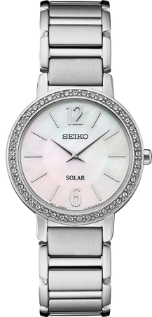From the Crystal Collection. Unmistakably sparkling, this elegant design from the Crystal Collection features 45 crystals set on the bezel to frame a classic mother-of-pearl dial with stylized Arabic numerals. A transparent radial pattern along the stick indices provides subtle dimensionality and richness. The energy-efficient solar cell, powered by any light source, with no battery change required, provides a 12-month power reserve when fully charged. Crafted of stainless steel, with a tri-fold push button release clasp. 3 bar, 30M Water Resistant