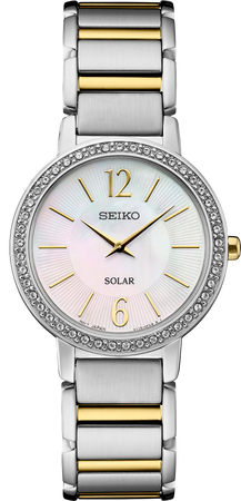 From the Crystal Collection. Unmistakably sparkling, this elegant design from the Crystal Collection features 45 crystals set on the bezel to frame a classic mother-of-pearl dial with gold accents and stylized Arabic numerals. A transparent radial pattern along the stick indices provides subtle dimensionality and richness. The energy-efficient solar cell, powered by any light source, with no battery change required, provides a 12-month power reserve when fully charged. Crafted of stainless steel, in a versatile two-tone finish, with a tri-fold push button release clasp. 3 bar, 30M Water Resistant
