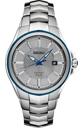 From the Coutura Collection. Delivering the perfect blend of sport and style for those on the move, Coutura is crafted for effortless timekeeping excellence. The newest designs offer fresh color variations with pops of contrast and an emphasis on modern luxury. Included is this sophisticated timepiece anchored by a gray dial with blue accents, date calendar and LumiBrite hands and markers, plus a bezel with blue ion finish. Crafted of stainless steel, with vigorously angular lines, this versatile watch includes a screwdown caseback, sapphire crystal and cabochon crown. Powered by any light source, with no battery change required, the energy-efficient solar cell provides a 10-month power reserve when fully charged. 10 bar, 100M Water Resistant