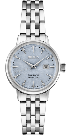 Seiko Presage Cocktail Time. Offering the finest in Japanese mechanical watchmaking, the Presage Collection blends precision technology with superior craftsmanship and design. Inspired by the vibrance of the city's modern lounges, the newest Cocktail Time designs express the excitement of today's Tokyo, with fresh styling and colors. With 8 diamonds adding sparkle to a pale blue dial with pressed pattern and gloss finish, this exquisite timepiece evokes the Skydiving cocktail. Sleek and elegant, the gracefully slender case houses the new, thinner caliber 21-jewel automatic mechanical 2R05 movement, which beats at a frequency of 21,600 vibrations per hour, with a power reserve of approximately 41 hours and manual winding capability. The beautifully tapered five-row bracelet features a mirror finish for additional brilliance. Crafted of stainless steel, with date calendar, box-shaped crystal, screwdown caseback, and deployment clasp with push button release. 5 bar, 50M Water Resistant