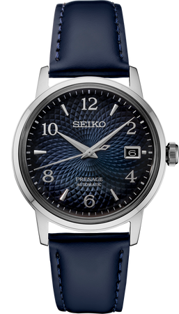 Seiko Presage Cocktail Time. Offering the finest in Japanese mechanical watchmaking, the Presage Collection blends precision technology with superior craftsmanship and design. Taking a more playful approach to the popular Cocktail theme line, this delightful watch is part of a group reflecting the casual charm of a vacation bar. Inspired by the Old Clock cocktail, its gradated deep blue dial features a pressed pattern reminiscent of the light reflected by a classic cocktail glass, as well as numerals styled to recall the printing on a vintage liquor label. The 23-jewel movement, with manual and automatic winding capability, beats at a frequency of 21,600 vibrations per hour, with a power reserve of approximately 41 hours. Crafted of stainless steel, this distinctive timepiece includes a calendar, box-shaped crystal, screwdown see-through caseback, smooth blue leather strap and tri-fold push button release clasp. 5 bar, 50M Water Resistant