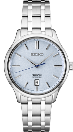 From the Presage Japanese Garden Collection. Offering the finest in Japanese mechanical watchmaking, the Presage Collection blends precision technology with superior craftsmanship and design. From a group inspired by the serenity of a traditional Japanese garden, this elegant US exclusive timepiece features a patterned light blue dial with textured indices evoking stepping stone paths, as well as a dual-curved sapphire crystal, blue second hand, and date calendar. The screwdown see-through caseback provides a view of the 23-jewel movement with manual and automatic winding capability, a frequency of 21,600 vibrations per hour and a power reserve of approximately 41 hours. Crafted of stainless steel, with deployment clasp and push button release. 3 bar, 30M Water Resistant