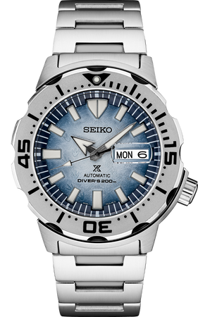 Prospex Special Edition. Designed for those who treat life as the ultimate adventure, Seiko Prospex keeps moving forward, meeting every challenge with technological excellence and winning design. With a gradient textured dial evoking the shimmering whites and blues of light reflecting off ice and the patterns of penguin footprints in the snow, this Special Edition automatic diver celebrates conservation efforts in Antarctica, the challenging environment in which the earliest Seiko diverβs watches proved their excellence as essential equipment for the Japanese Antarctic Research Expedition (JARE). Recalling one of Seikoβs most iconic diving styles, this rugged watch features a uni-directional rotating elapsed timing bezel with a deeply grooved edge. Providing reliable timing in the most demanding conditions, the 24-jewel automatic movement beats at a frequency of 21,600 vibrations per hour, with a power reserve of approximately 41 hours, and offers manual winding capability. With magnified day/date calendar, and LumiBrite hands and markers, this high-intensity timepiece, following ISO standards for scuba diving at depths of up to 200 meters, is crafted of stainless steel, with secure screwdown crown and caseback. 200m Water Resistant