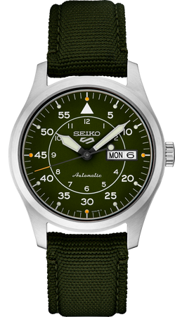 Seiko 5 Sports Collection. Inspired by the vintage designs worn by early pilots, this updated classic offers genuine style with both durability and all-day versatility. Providing automatic technology that you control with every movement, this distinctive watch is powered by a 24-jewel movement that beats at a frequency of 21,600 vibrations per hour, with a power reserve of approximately 41 hours and manual winding capability. With a 60-minute track marked in five-minute increments, the green dial features a day/date calendar, and luminous hands and markers. The orange-tipped second hand provides bright punctuation, intensified by the matching orange liner of the green nylon strap. Crafted of stainless steel with a screwdown see-through caseback for a view of classic timekeeping in action. 10 bar, 100M Water Resistant