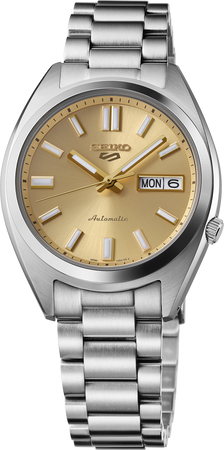 Show your style. Make your move. For over 50 years, Seiko 5 Sports has delivered consistently high levels of reliability, durability, and performance. Inspired by the best-selling SNXS series from the classic Seiko 5 collection of the past, this exceptional watch offers a compact case and bracelet design incorporating iconic elements of the original models with upgraded performance for today. Providing automatic technology that you control with every movement, this dynamic timepiece is powered by a 24-jewel movement that beats at a frequency of 21,600 vibrations per hour, with a power reserve of approximately 41 hours and manual winding capability. Framed by a metallic minute track, the golden sunray finish dial features diamond cut indices with gold finish and grooved top surfaces, a day/date calendar, and LumiBrite coating on the hands and markers for enhanced visibility in low-light conditions. Crafted of stainless steel with hairline and mirror finish, the sharply designed case has a low center of gravity for a comfortable fit and features a screwdown see-through caseback for a view of classic timekeeping in action, flowing seamlessly to a stainless steel bracelet with a tri-fold push button release clasp. 10 bar, 100M Water Resistant