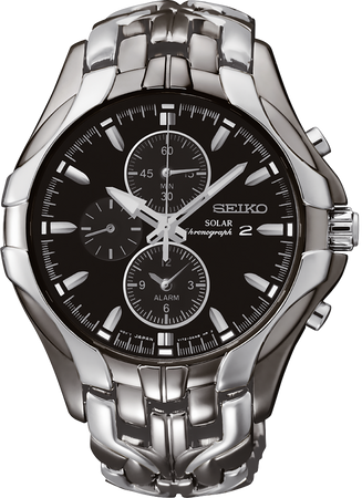 Seiko Solar Alarm Chronograph. No battery change required and powered by all types of light. Solar cell with high performance electricity generation. Energy-efficient movement with long power reserve. This handsome timepiece has a black ion-finished stainless steel case and bracelet. Its black dial features three chronograph subdials, luminous hands and markers, and date calendar. Alarm can be set on a 12-hour basis with two small hands. Chronograph measures up to 60 minutes in 1/5 second increments with split time measurement. Alarm hands can indicate the time in a different time zone. 100 meters water resistant.