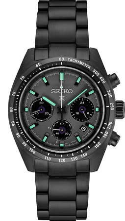 Seiko Black Series Speedtimer Solar Chronograph. Designed for those who treat life as the ultimate adventure, Seiko Prospex keeps moving forward, meeting every challenge with technological excellence and winning design. This dramatic watch is part of a high-intensity collection inspired by the 1969 “Speedtimer,” the world’s first self-winding chronograph, extending it to the Black Series. Featuring the newly developed “Green LumiBrite Pro,” developed for divers by combining the color most recognizable in the dark with a higher brightness and longer afterglow, this extraordinary timepiece provides a “night vision” for visibility in the dark similar to the view seen through a night scope. The chronograph function measures up to 60 minutes of elapsed time in 1/5-second increments and includes a split time function, while the solar cell, powered by any light source, with no battery change required, provides a 6-month power reserve when fully charged. The dark gray dial includes three black subdials, with a 24-hour indicator and power reserve indicator, as well as a date calendar and green LumiBrite on hands, markers and the tip of the chronograph hand. Crafted of stainless steel with black hard coating, curved anti-reflective sapphire crystal, black tachymeter bezel, secure screwdown caseback and tapered three-link bracelet with tri-fold push button release clasp. 10 bar, 100M Water Resistant