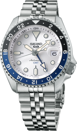 Seiko 5 Sports SKX Sports Style GMT Series. Adding new richness to classic sport/dress design, this dynamic watch offers a new variation on the popular “SKX” style. Equipped with automatic technology that you control with every movement, this versatile watch is powered by a 24-jewel movement that beats at a frequency of 21,600 vibrations per hour, with a power reserve of approximately 41 hours and manual winding capability. The silver dial features bold luminous hands and markers and a magnified date calendar, as well as a large blue GMT hand for instant visibility and is framed by a dramatic dual-tone blue and black GMT bezel. A stylized five-row stainless steel bracelet, with tri-fold push button release clasp and lock, adds rich texture and wearability, while the stainless steel case includes a screwdown see-through caseback for a view of classic timekeeping in action. 10 bar, 100M Water Resistant
