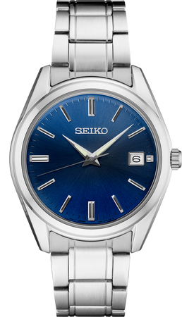 From the Essentials Collection. With classic dress/sport styling, this perfectly tailored design combines sophisticated minimalism with versatility. The sunray-finish blue dial features a date calendar and LumiBrite hands. In stainless steel, with sapphire crystal for superior scratch resistance. 10 bar, 100M Water Resistant