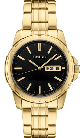 From the Essentials Collection. Offering classic dress/sport designs, the Essentials Collection provides the ideal solution for both everyday wear and dress occasions. Crafted of stainless steel, with gold tone polished and brushed finishes, this perfectly tailored design features a black sunray dial with gold accents, day/date calendar, and LumiBrite hands and markers. 10 bar, 100M Water Resistant