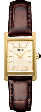 From the Essentials Collection. Offering classic dress/sport design, the Essentials Collection provides the ideal solution for everyday wear. Giving a new slant to a traditional rectangular style with a subtly patterned light champagne sunray dial, this perfectly tailored watch features a stainless steel case in gold finish, cabochon crown and textured brown leather strap. 3 bar, 30M Water Resistant